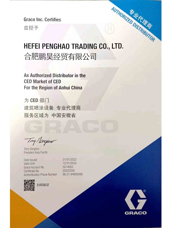 GRACO公司2012年亚太地区金牌代理商证书